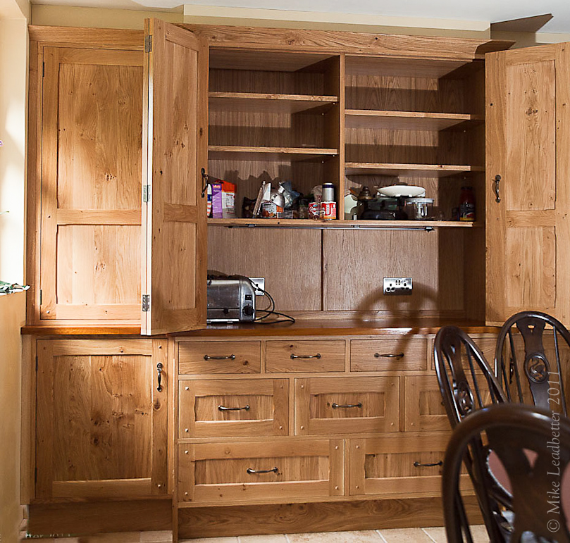 Large traditional oak kitchen with Nero Assoluto black marble and Juperano Persa worktops. Units are designed to have an 'unfitted' look as if they were bought individually and perfectly fit the space.